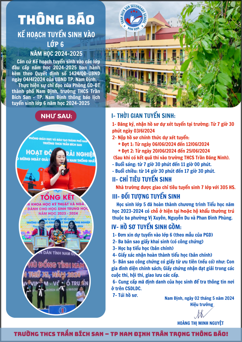 Thực hiện sự chỉ đạo của Phòng GD-ĐT thành phố Nam Định, trường THCS Trần Bích San – TP Nam Định thông báo lịch tuyển sinh lớp 6 năm học 2024 – 2025 như sau: